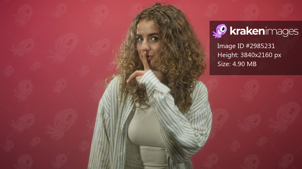 Young curly haired woman finger to lips gesture showing finger and upper chest, wearing striped shirt and tank top in studio; playful secrecy.