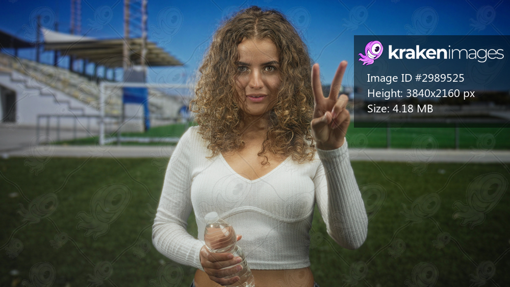 Young curly haired woman holding a clear water bottle and showing peace sign in building stadium stands; playfulness.