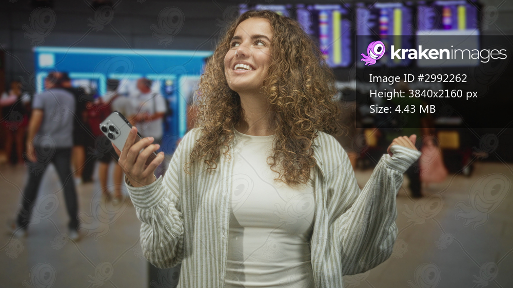 Young curly haired woman holding smartphone and pointing with finger at a departure board in an airport terminal while smiling and carrying a suitcase; joy travel. - Kraken Images
