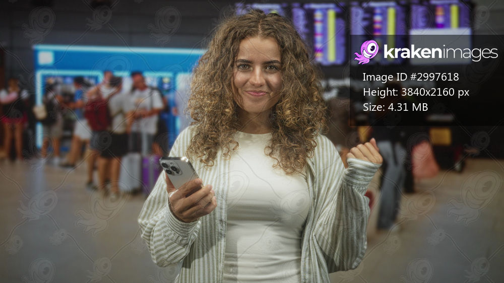 Young curly haired woman holding smartphone and pointing with finger at a departure board in an airport terminal while smiling and carrying a suitcase; joy travel. - Kraken Images
