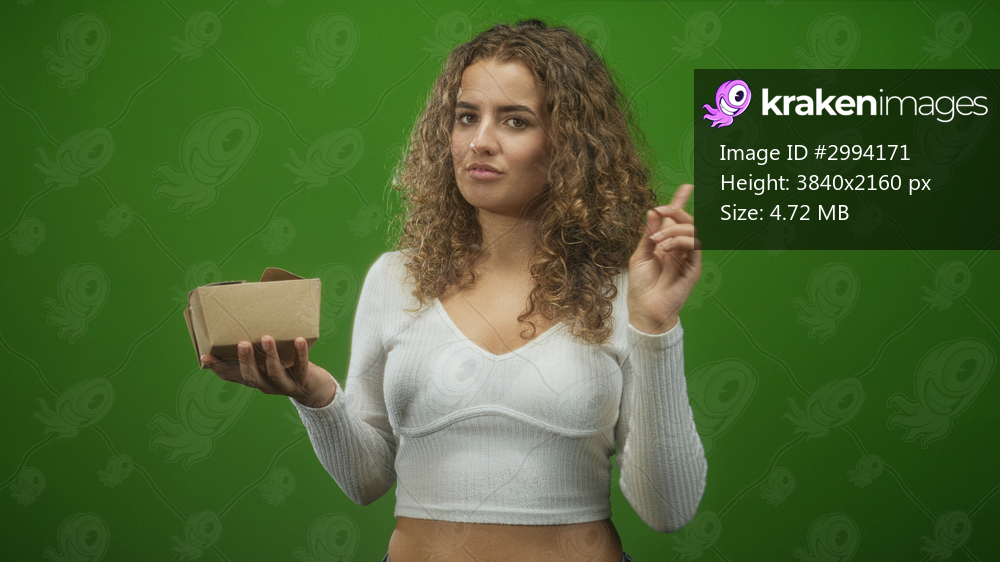 Young curly haired woman holds cardboard delivery box with exposed lid and points finger toward camera in green studio; skeptical pause.