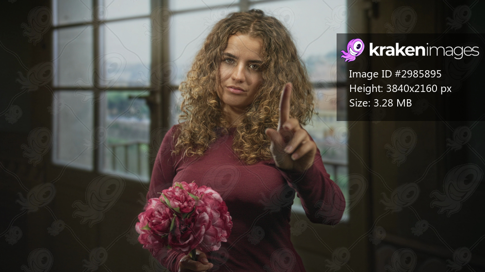 Young curly haired woman points finger forward while holding pink peony bouquet near tall window in building; quiet contemplation.