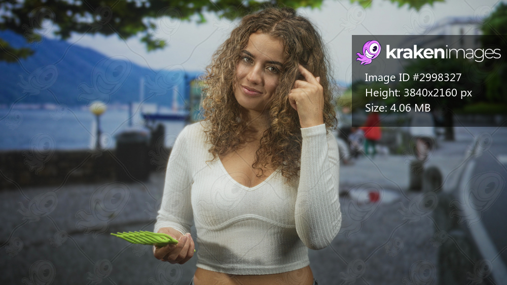 Young curly woman holding green comb points finger to temple on street promenade with visible midriff and relaxed smile; playful curiosity.