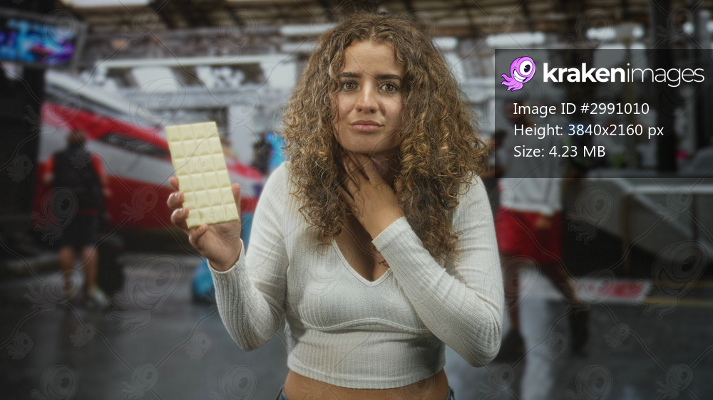 Young curly woman holds white chocolate bar, hand on throat in busy building; temptation discomfort.