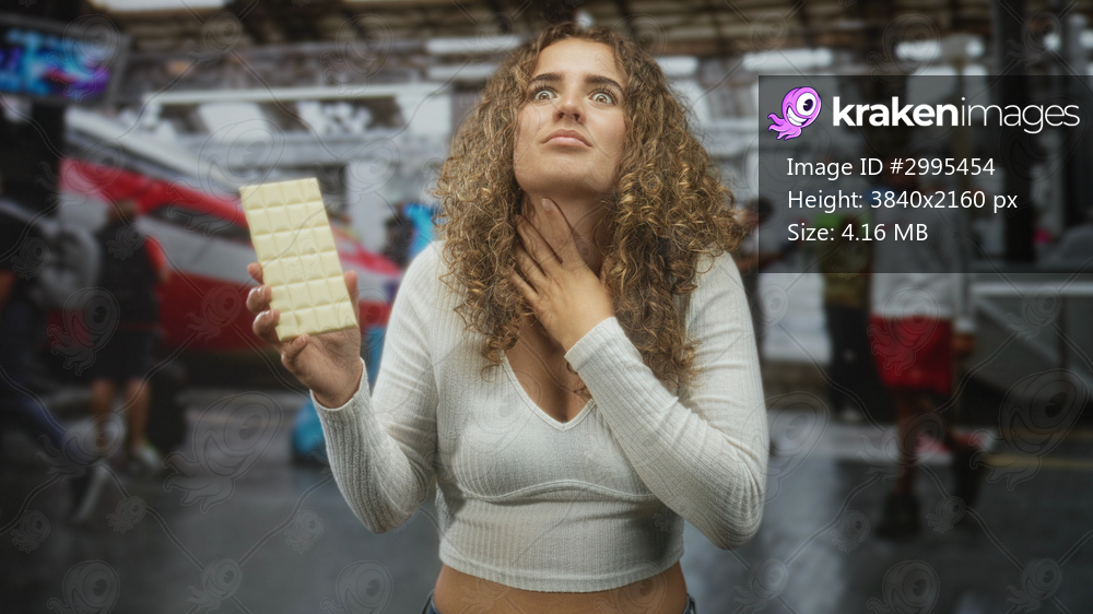 Young curly woman holds white chocolate bar, hand on throat in busy building; temptation discomfort.