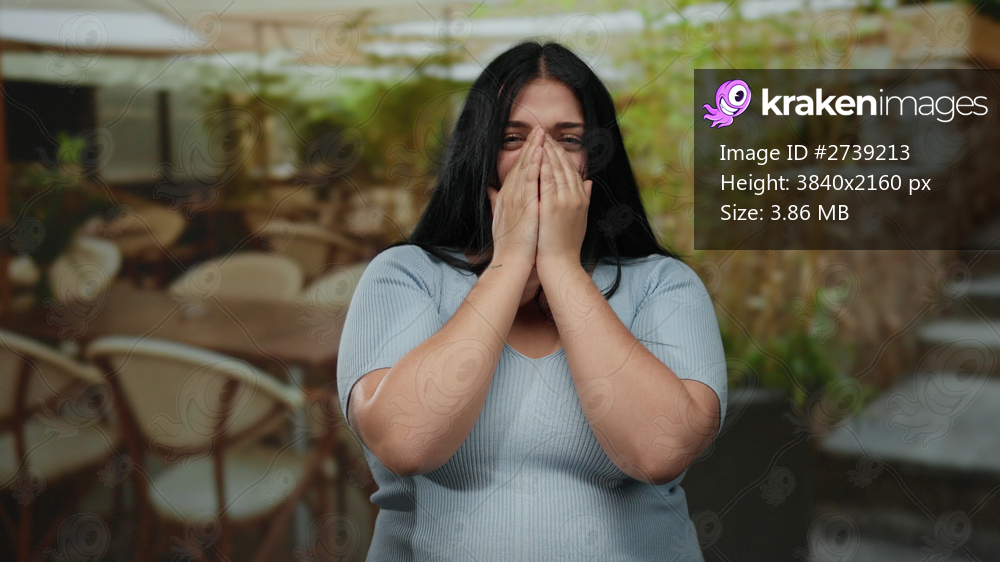 Young curvy woman with dark hair sitting on a terrace in an outdoor restaurant, enjoying a casual moment.