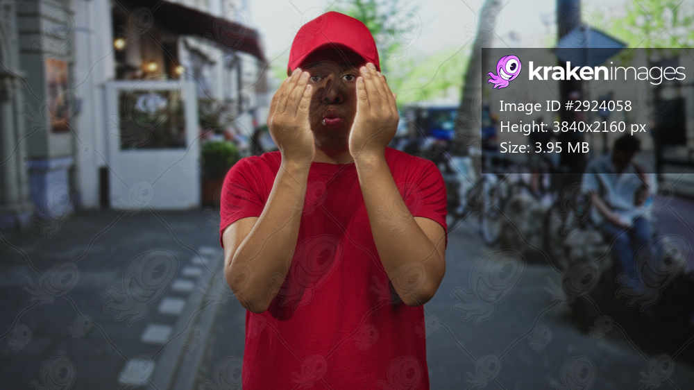 Young delivery man in red cap and shirt smiling then covers face with hands on a busy city street with bicycles and buildings nearby; embarrassment.