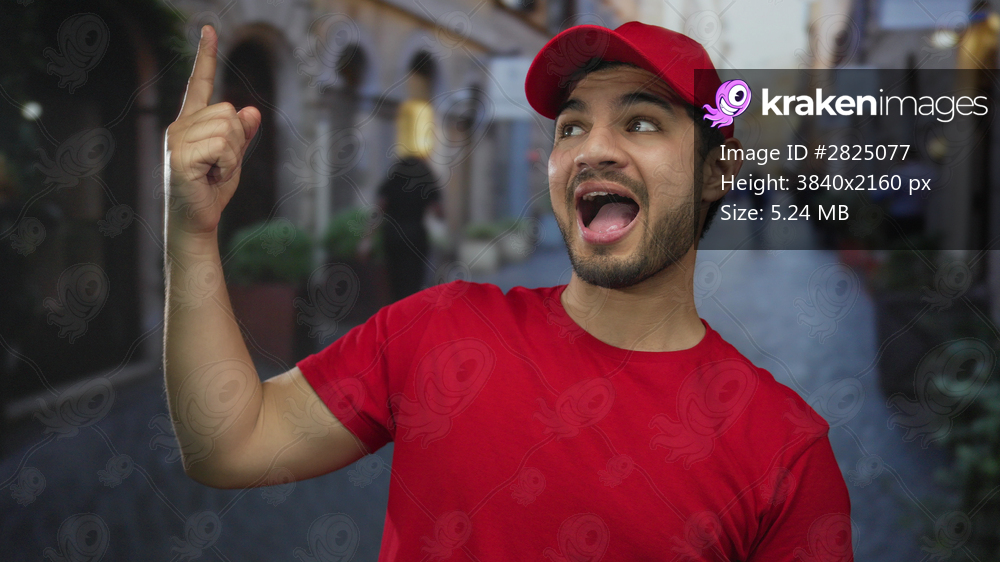 Young delivery man in red uniform shows thumbs up and thumbs down gesture amid a busy street; indecision.