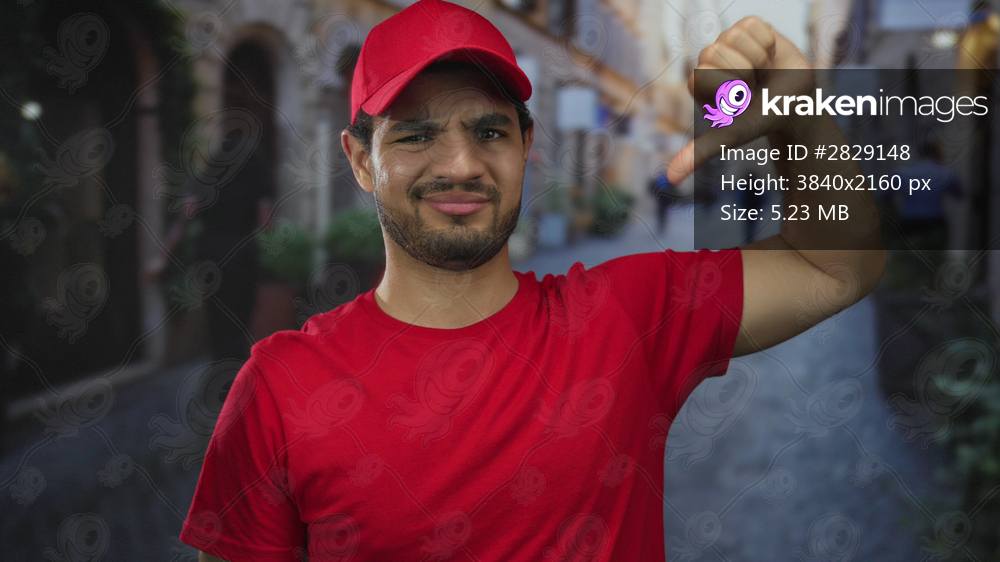 Young delivery man in red uniform shows thumbs up and thumbs down gesture amid a busy street; indecision.