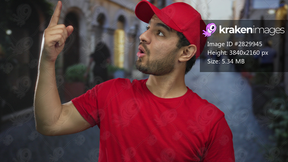 Young delivery man in red uniform shows thumbs up and thumbs down gesture amid a busy street; indecision.