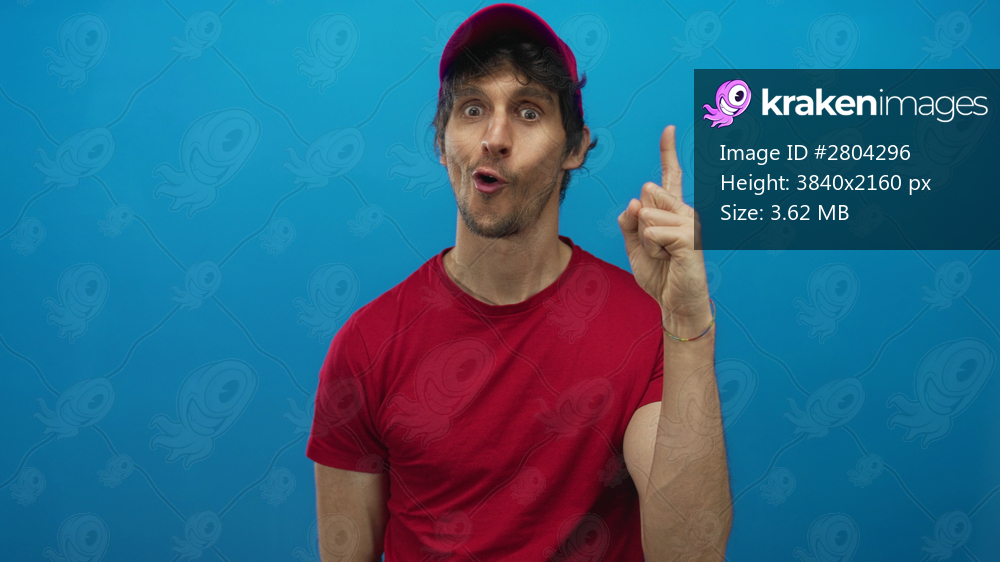 Young delivery man wearing red cap and shirt points finger upward in blue studio with thoughtful expression; curiosity.
