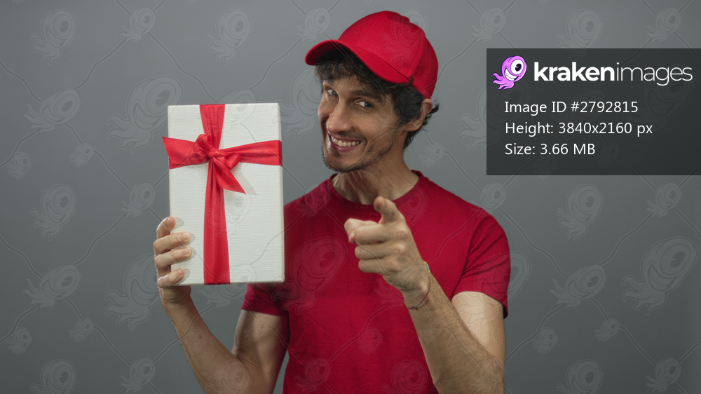 Young delivery man wearing red cap and tshirt holds giftbox and points finger in studio; celebration.