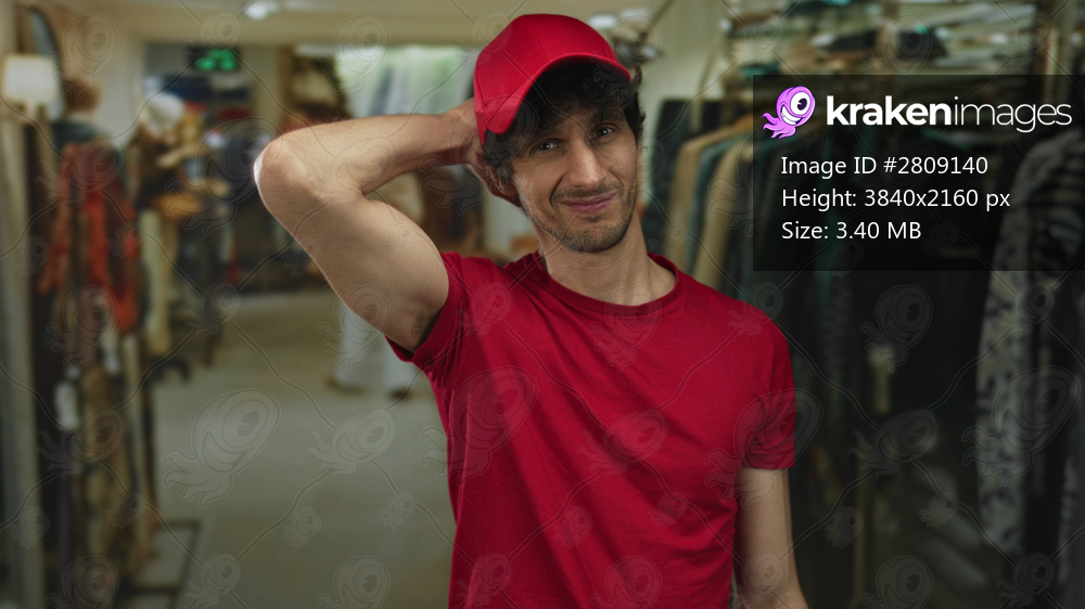 Young delivery man wearing red tshirt adjusts cap in building aisle under clothing racks; uncertainty.