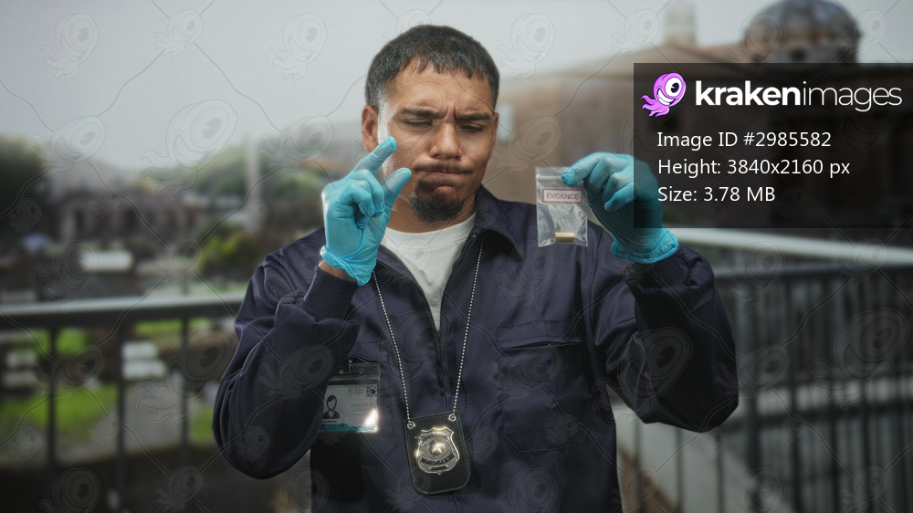 Young detective in badge and jacket holds small evidence bag with bullet, wearing blue nitrile gloves and points finger to bag on building balcony; investigation duty. - Kraken Images