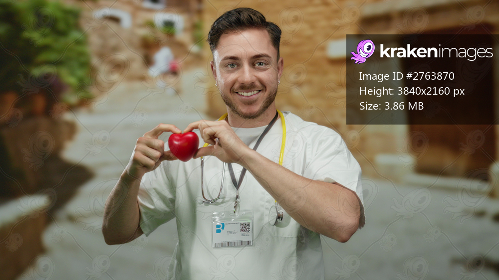 Young doctor with a beard holding a heart-shaped object in a city street, wearing a stethoscope and a name tag, symbolizing healthcare and compassion outdoors. - Kraken Images