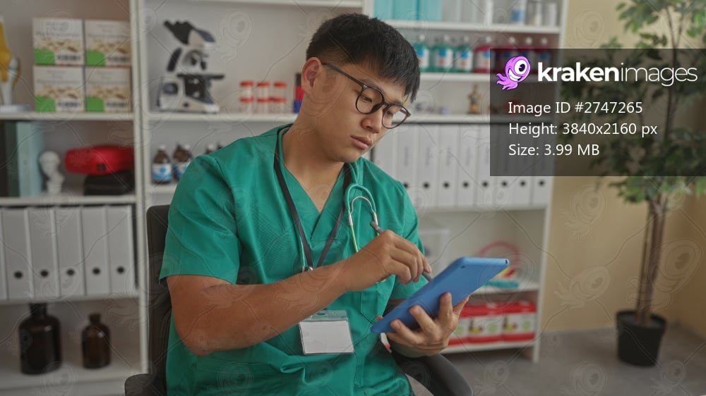 Young doctor in a clinic using a tablet with focus on concentration and technology in a modern medical workplace