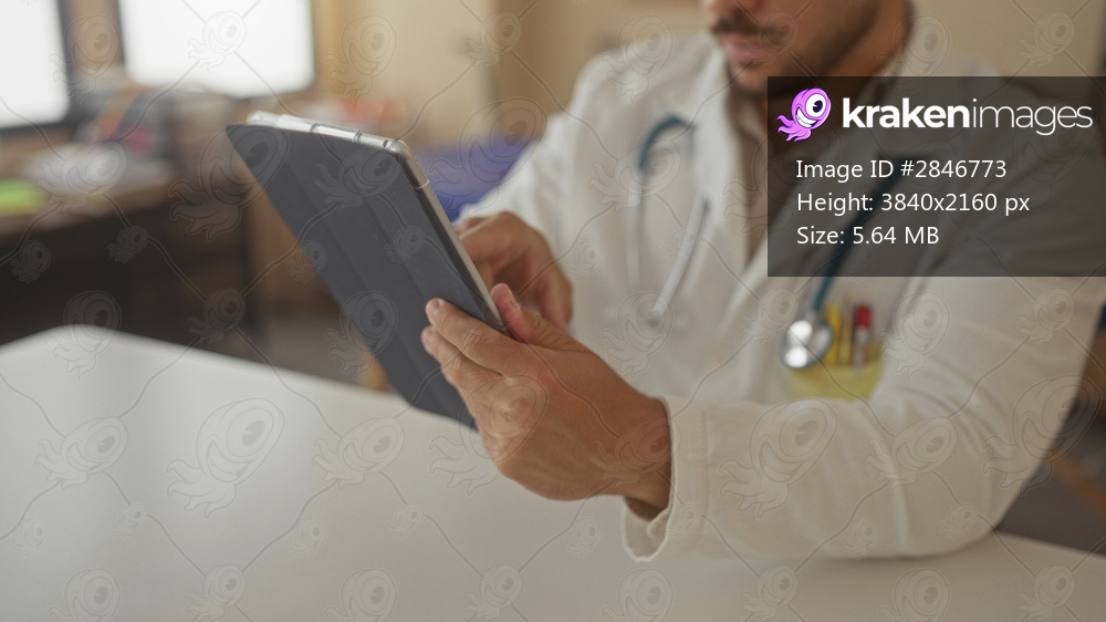 Young doctor man holds tablet with finger pointing to screen in clinic building while wearing stethoscope on white coat; concentration.
