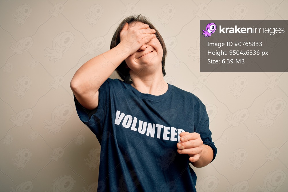 Young down syndrome volunteer woman wearing social care charity t-shirt smiling and laughing with hand on face covering eyes for surprise. Blind concept. - Kraken Images