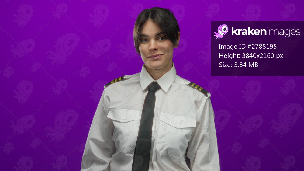 Young female hispanic pilot in uniform gestures confidently against a vivid purple background, emphasizing professionalism and aviation expertise.