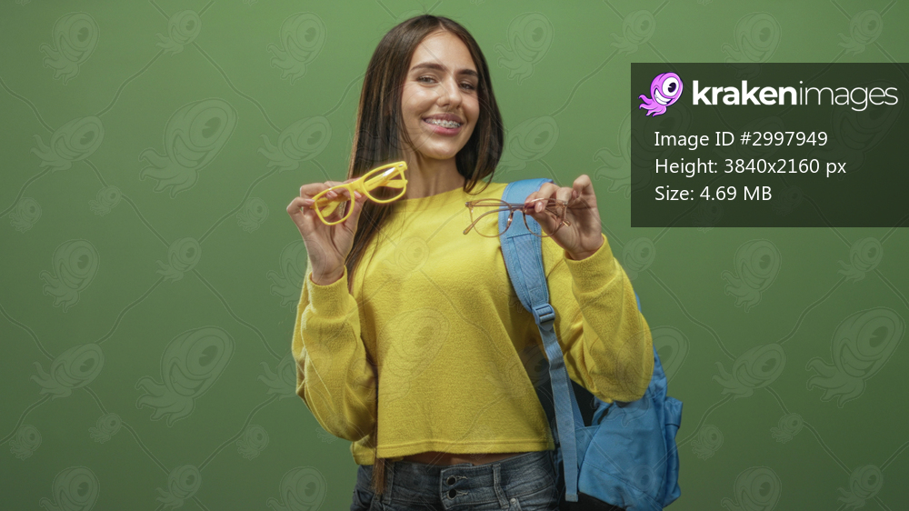 Young female student holds yellow sunglasses and brown eyeglasses with both hands while puckering lips against green studio backdrop; playful choice.