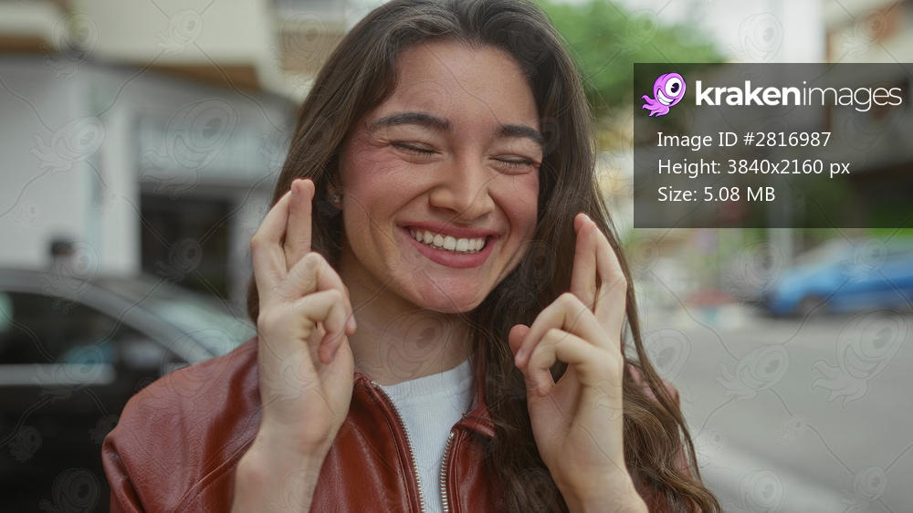 Young friendly woman in brown leather jacket crossing fingers and smiling on busy sunlit city street; hope.