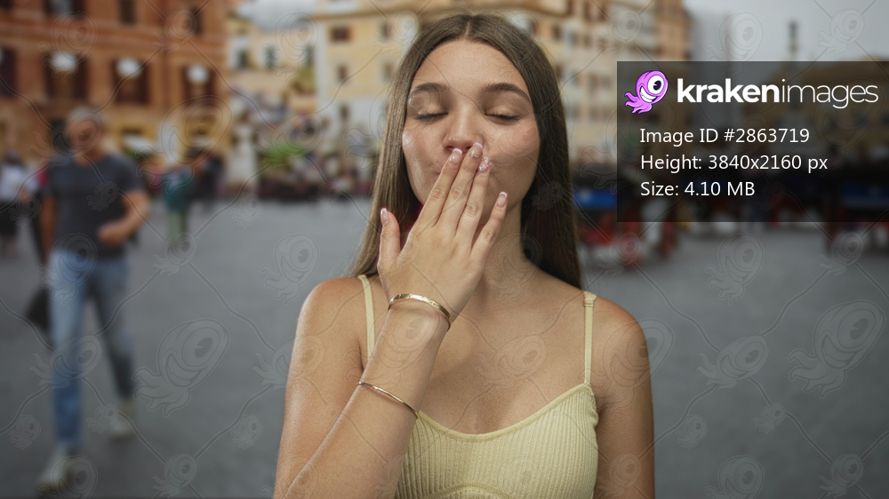 Young girl blowing kiss in historic cobblestone street under warm afternoon sunlight wearing casual summer top; affection.