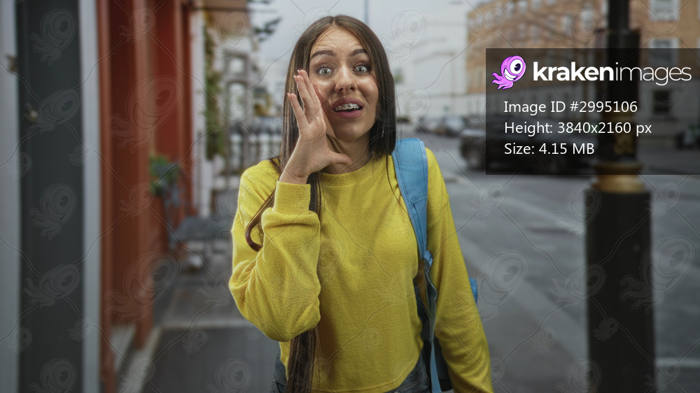 Young girl student in yellow sweater with blue backpack cupping hands to shout on street; excitement urgency.
