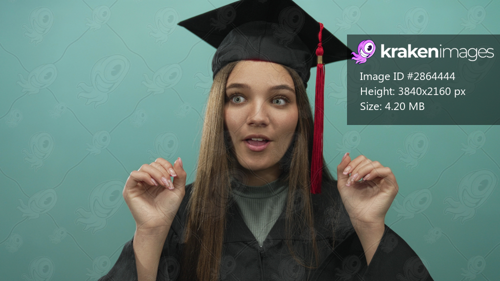 Young graduate woman rubbing her eyes with graduation cap and gown in studio with teal backdrop; tiredness success.