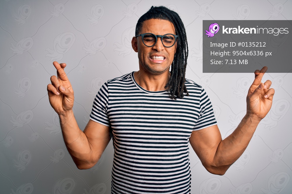 Young handsome african american man with dreadlocks wearing striped t-shirt and glasses gesturing finger crossed smiling with hope and eyes closed. Luck and superstitious concept. - Kraken Images