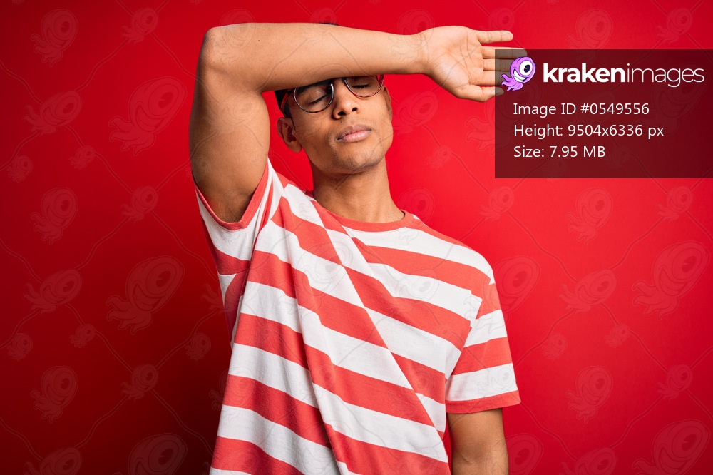 Young handsome african american man wearing casual striped t-shirt and glasses covering eyes with arm, looking serious and sad. Sightless, hiding and rejection concept - Kraken Images