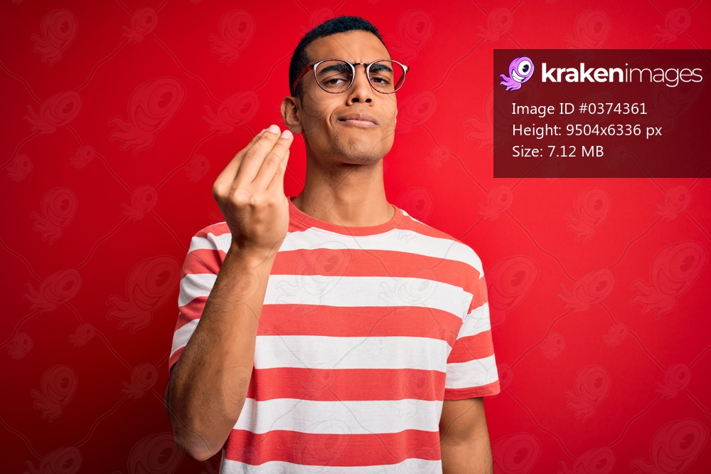 Young handsome african american man wearing casual striped t-shirt and glasses Doing Italian gesture with hand and fingers confident expression