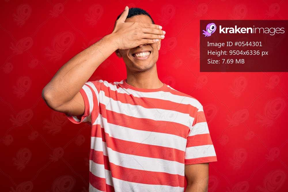 Young handsome african american man wearing casual striped t-shirt and glasses smiling and laughing with hand on face covering eyes for surprise. Blind concept. - Kraken Images
