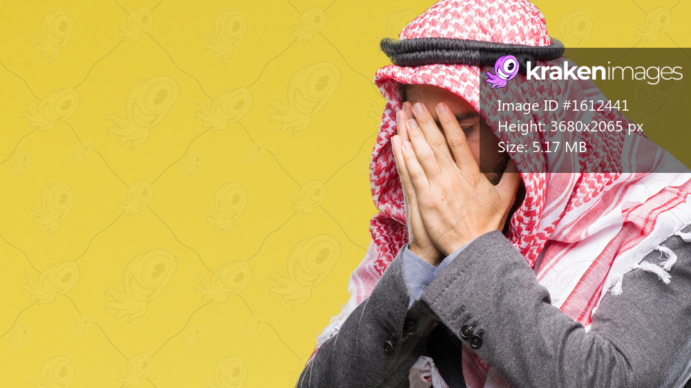 Young handsome arabian man with long hair wearing keffiyeh over isolated background with sad expression covering face with hands while crying. Depression concept. - Kraken Images