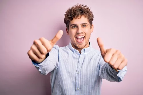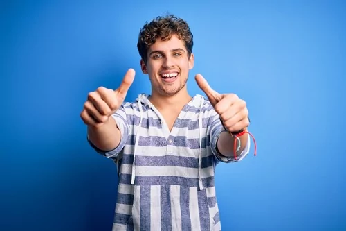 Young handsome blond man approving doing positive gesture with hand, thumbs up smiling and happy for success. Looking at the camera, winner gesture.