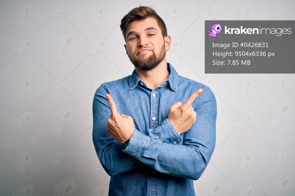 Young handsome blond man with beard and blue eyes wearing casual denim shirt Pointing to both sides with fingers, different direction disagree