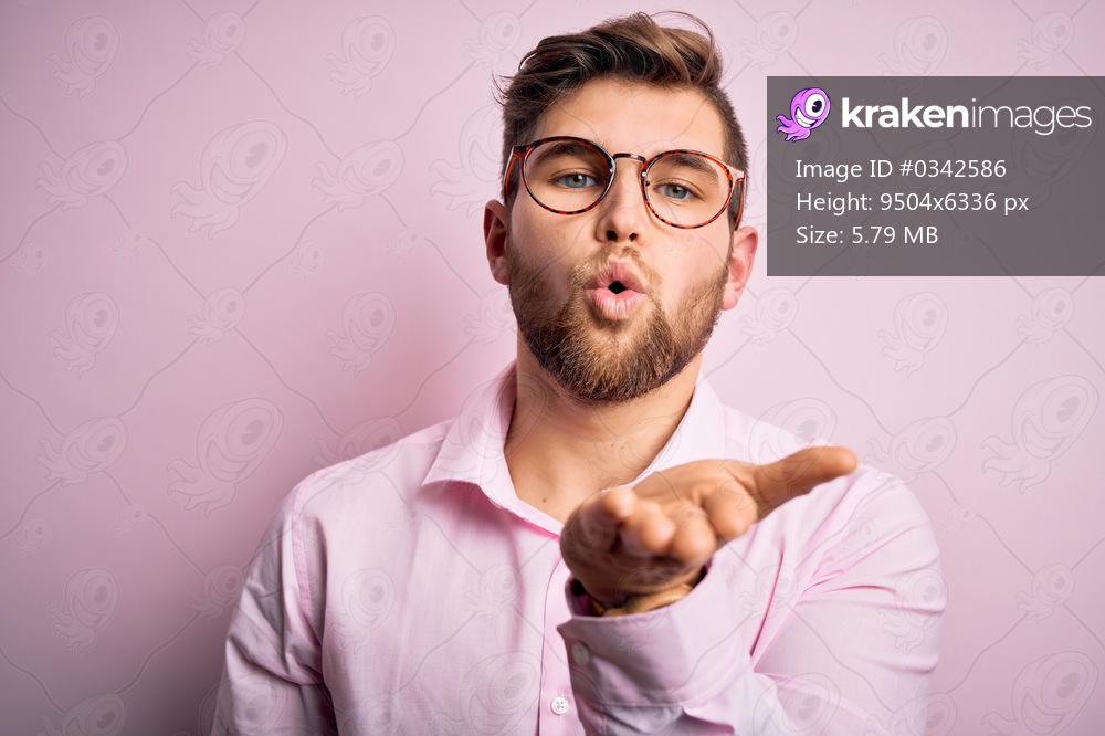 Young handsome blond man with beard and blue eyes wearing pink shirt and glasses looking at the camera blowing a kiss with hand on air being lovely and sexy. Love expression. - Kraken Images