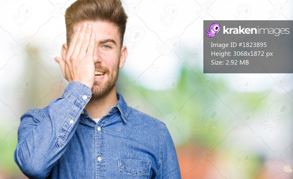 Young handsome blond man wearing casual denim shirt covering one eye with hand with confident smile on face and surprise emotion.
