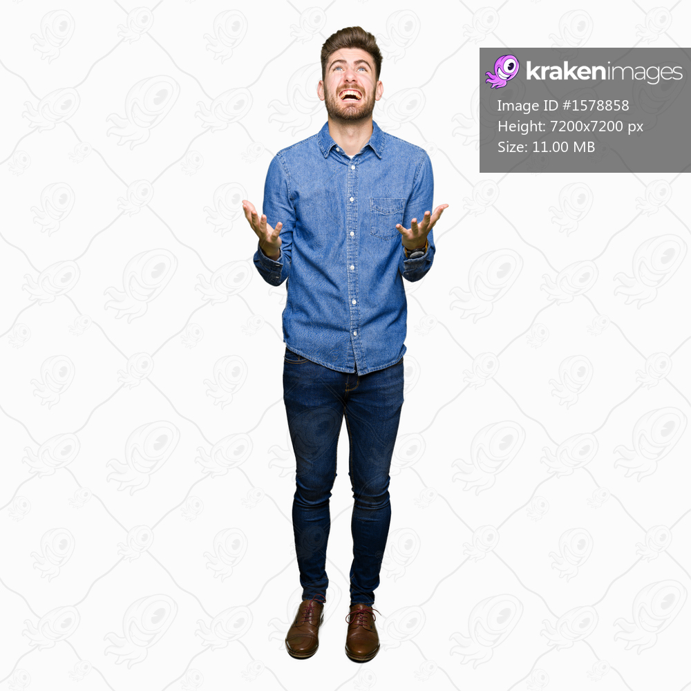 Young handsome blond man wearing casual denim shirt crazy and mad shouting and yelling with aggressive expression and arms raised. Frustration concept. - Kraken Images