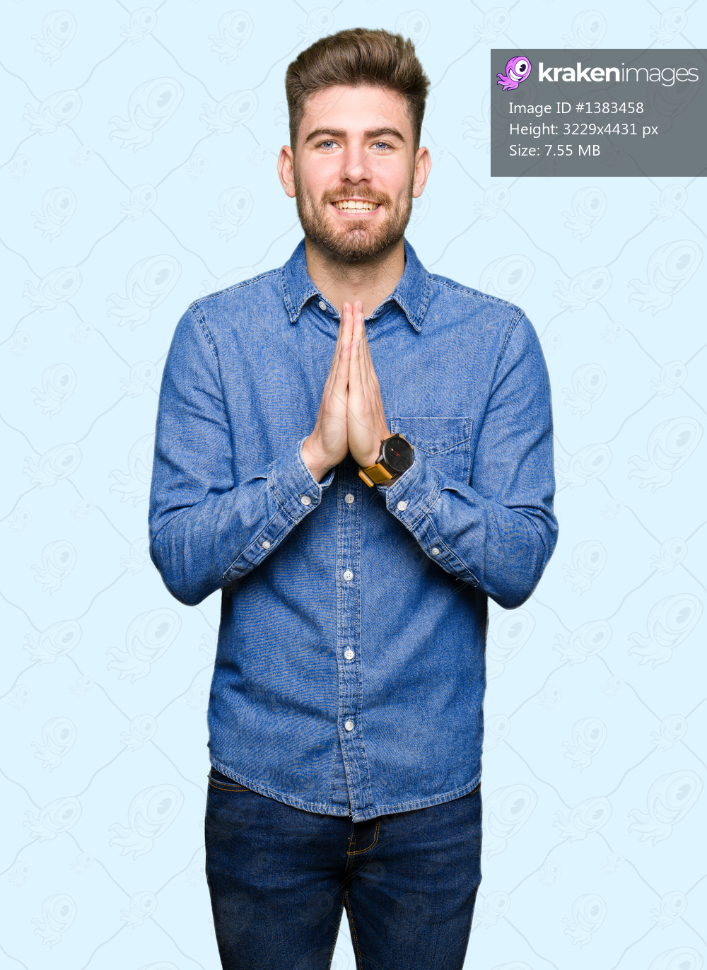 Young handsome blond man wearing casual denim shirt praying with hands together asking for forgiveness smiling confident.