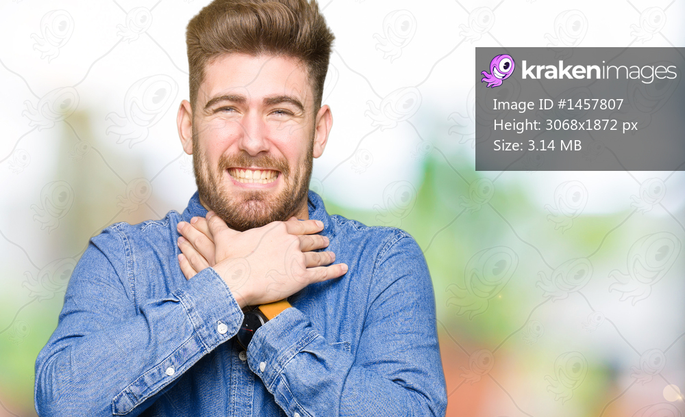 Young handsome blond man wearing casual denim shirt shouting and suffocate because painful strangle. Health problem. Asphyxiate and suicide concept.