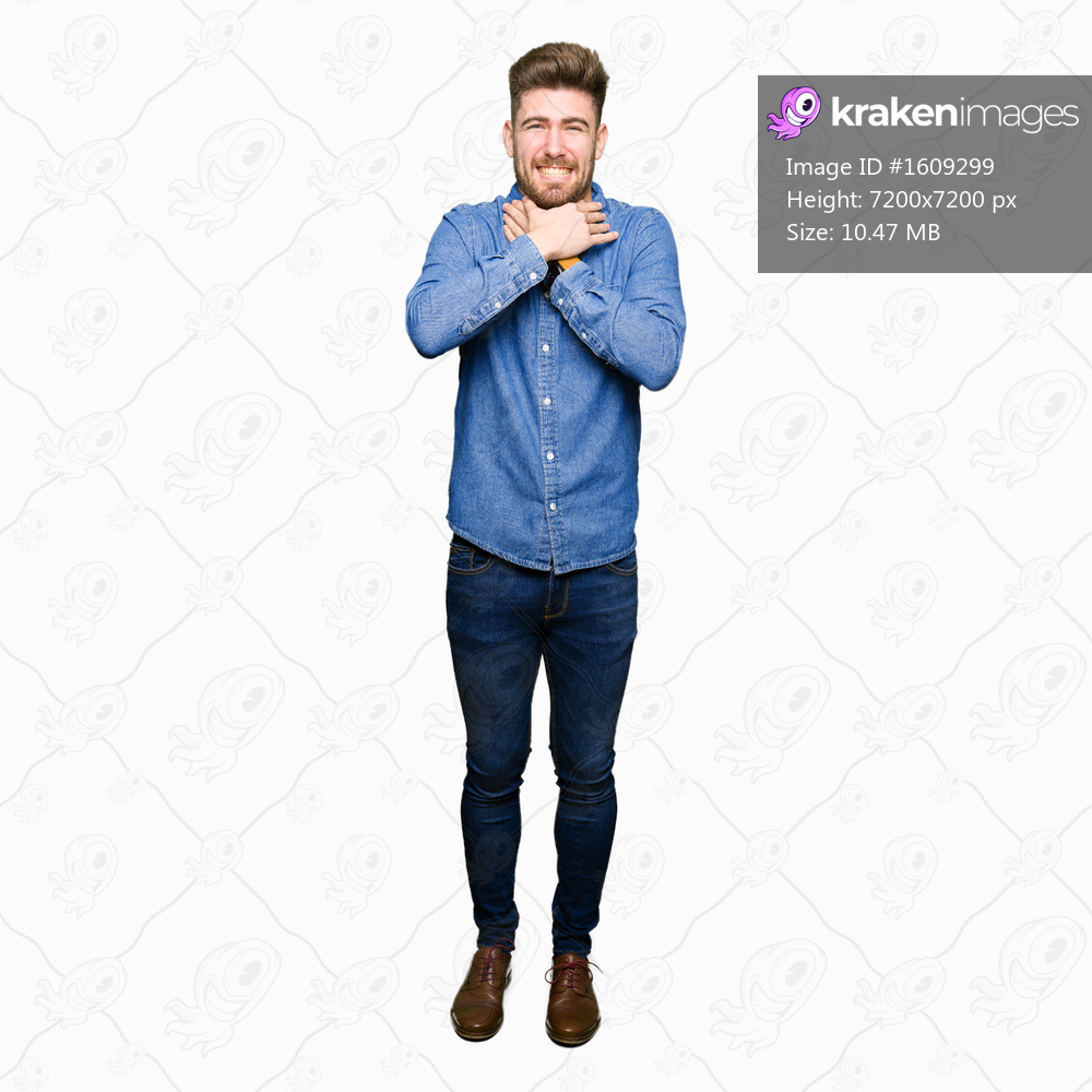 Young handsome blond man wearing casual denim shirt shouting and suffocate because painful strangle. Health problem. Asphyxiate and suicide concept.