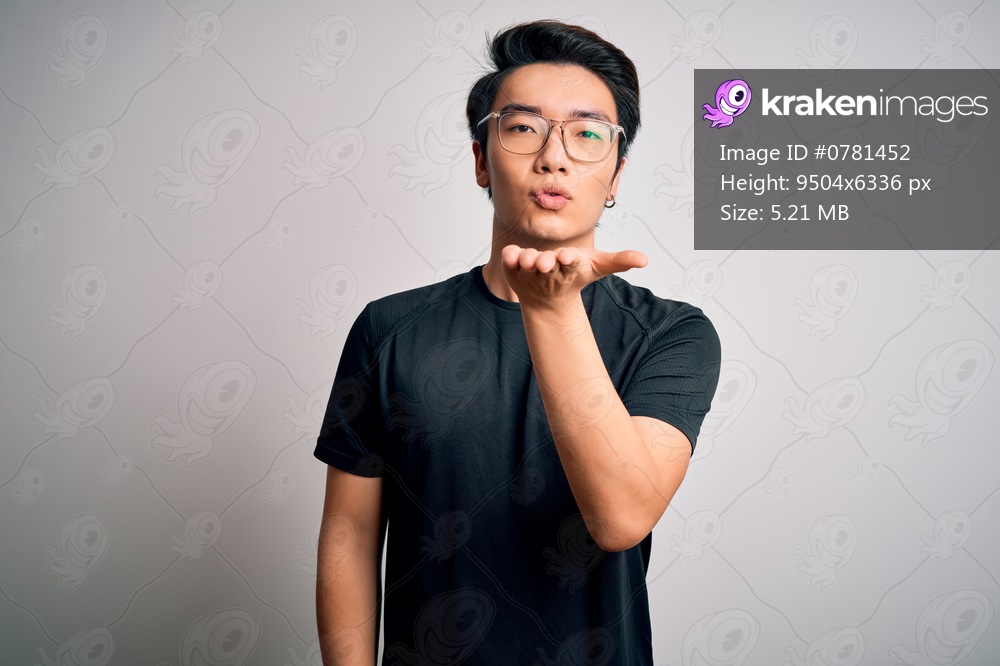 Young handsome chinese man wearing black t-shirt and glasses over white background looking at the camera blowing a kiss with hand on air being lovely and sexy. Love expression. - Kraken Images