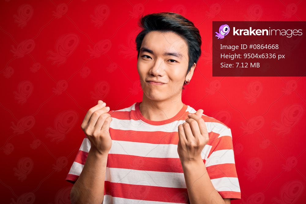 Young handsome chinese man wearing casual striped t-shirt standing over red background doing money gesture with hands, asking for salary payment, millionaire business - Kraken Images