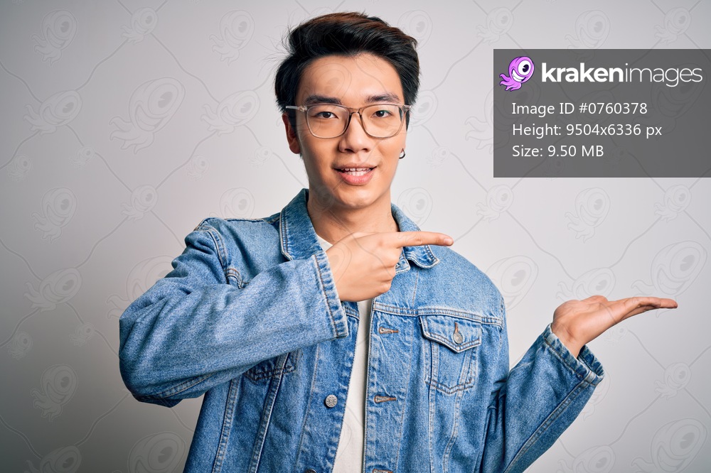 Young handsome chinese man wearing denim jacket and glasses over white background amazed and smiling to the camera while presenting with hand and pointing with finger. - Kraken Images