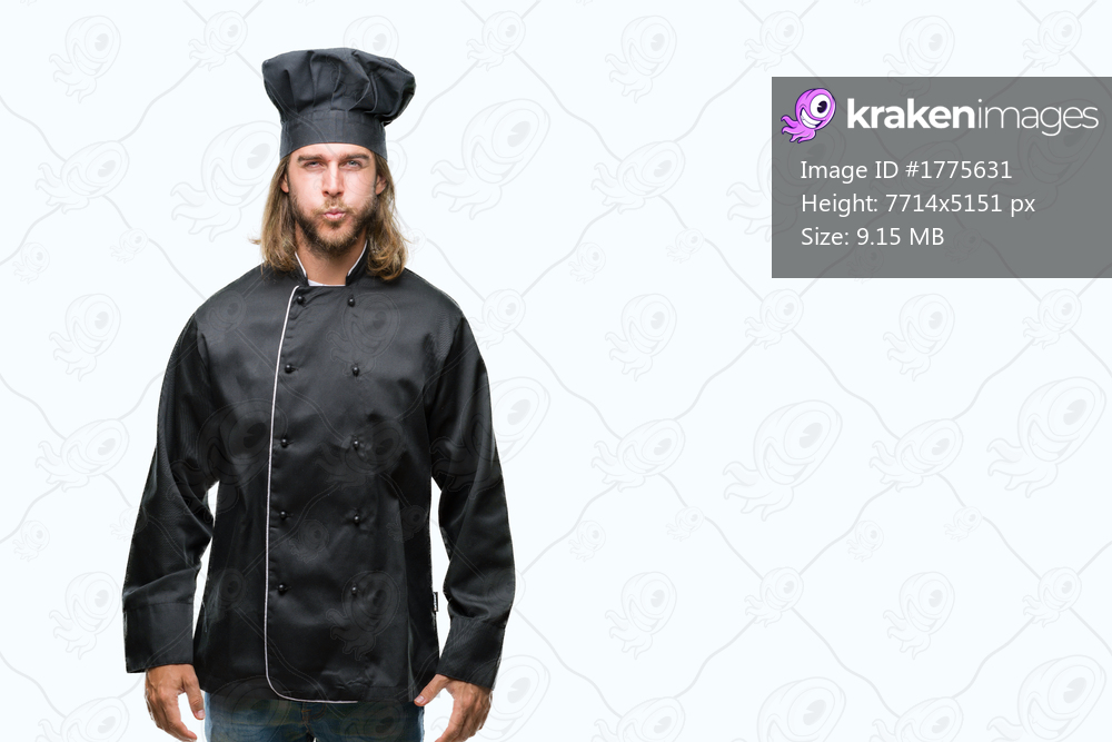 Young handsome cook man with long hair over isolated background puffing cheeks with funny face. Mouth inflated with air, crazy expression.