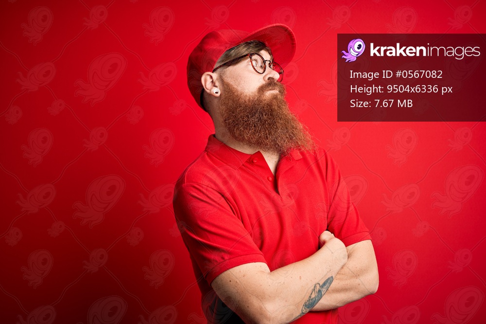Young handsome delivery man wearing glasses and red cap over isolated background looking to the side with arms crossed convinced and confident