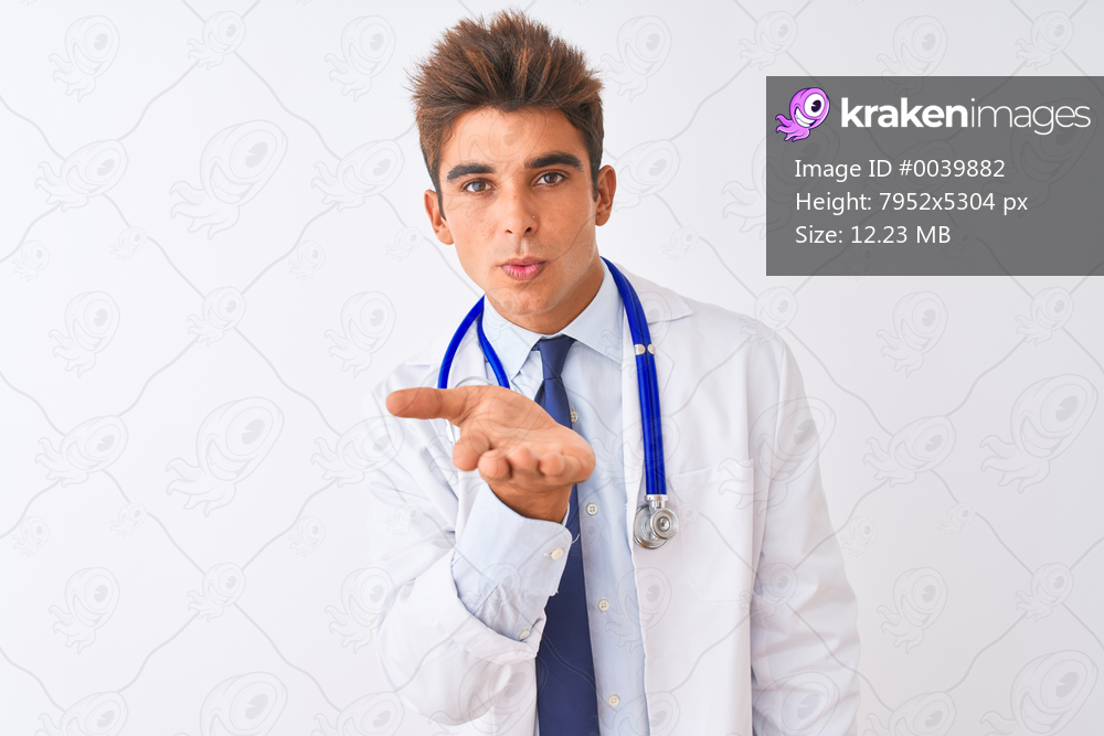 Young handsome doctor man wearing stethoscope over isolated white background looking at the camera blowing a kiss with hand on air being lovely and sexy. Love expression. - Kraken Images