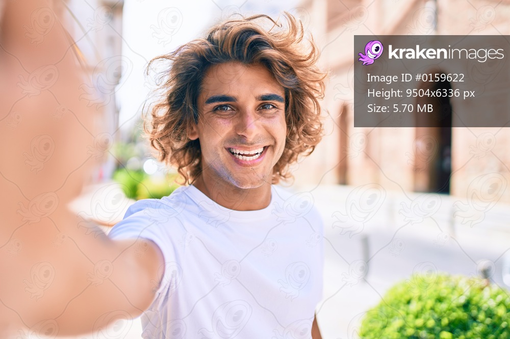 Young handsome hispanic man smiling happy making selfie by the camera at street of city