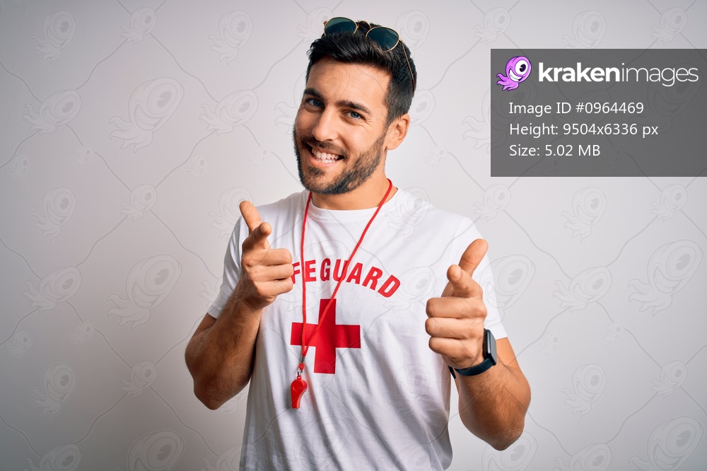 Young handsome lifeguard man with beard wearing t-shirt with red cross and whistle pointing fingers to camera with happy and funny face. Good energy and vibes. - Kraken Images