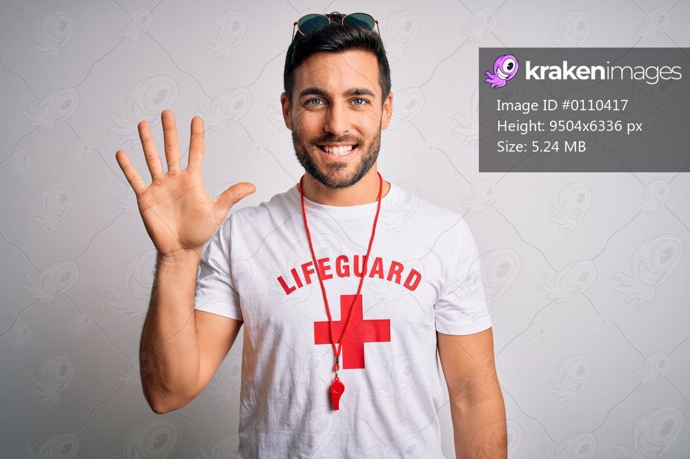 Young handsome lifeguard man with beard wearing t-shirt with red cross and whistle showing and pointing up with fingers number five while smiling confident and happy. - Kraken Images